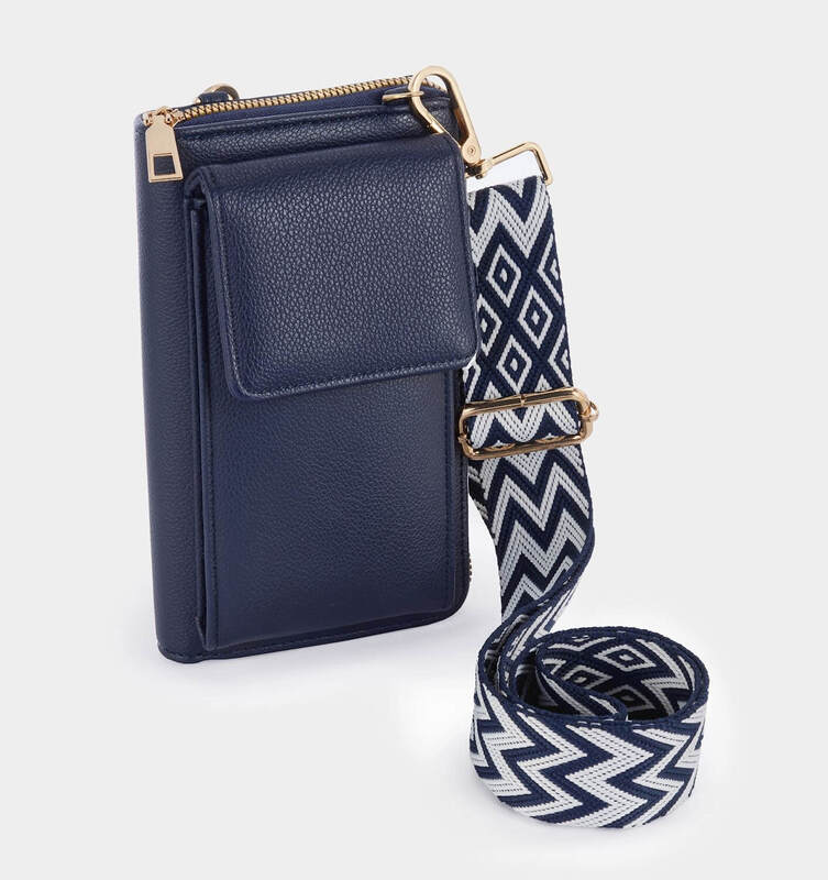 Featuring a navy blue leather finish, gold hardware, and a boho patterned white and blue adjustable shoulder strap, this wallet packs a punch.
