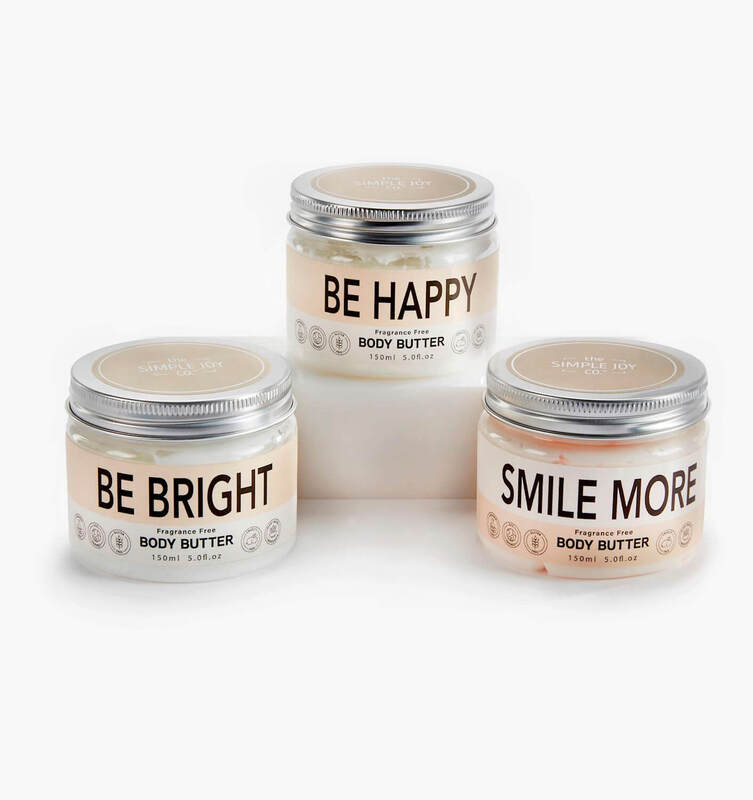 Smooth, nourish, and soften skin with this Fragrance Free Body Butter (150 ml). This super clean moisturizer comes packaged in a jar with a cheerful sentiment and a pastel tone-tone design. Available in 3 assorted sentiments: BE HAPPY, SMILE MORE, and BE BRIGHT.