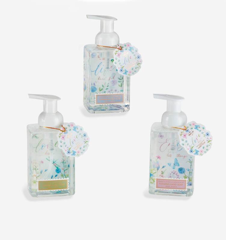 Keep hands clean and smelling their best with this garden Scented Foaming Hand Soap (500 ml). Comes in a clear bottle with a pump and features a paper back label with a colorful sentiment and floral design. Available in 3 assorted scents with sentiments: Vanilla & White Musk/ENJOY THE LITTLE THINGS, Freesia & White Pear/LOVE LIVES HERE, and Vetiver & Blossom Breeze/LIFE IS BEAUTIFUL.