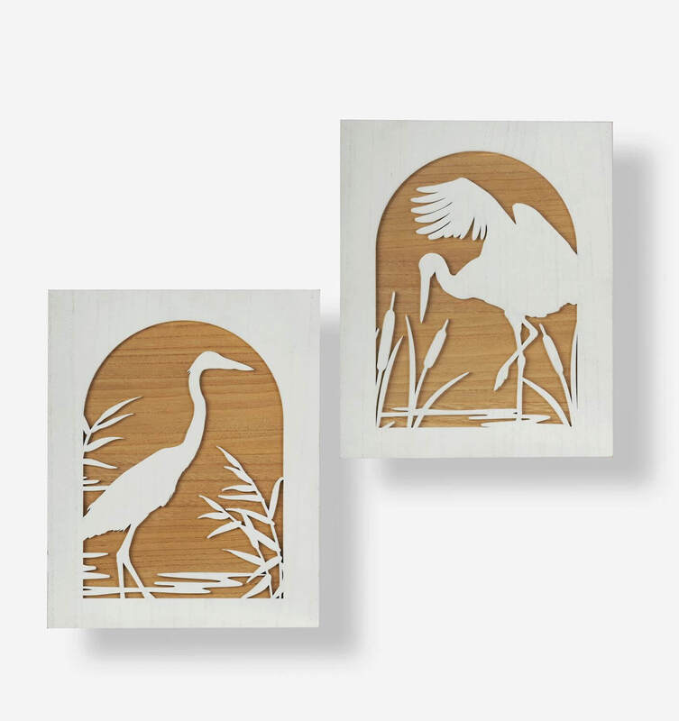 This vertical wall accent features a rectangular wood plank design with laser cut water Crane bird motifs and riverside flora in a tranquil white and natural wood-brown finish. MDF.