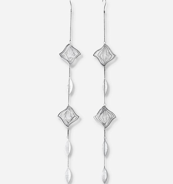 This all-silver metal hanging decor features two contemporary spinner designs with garden wildlife charms inside and textured leaf charm danglers. Comes with a chain hanger with a C-hook.