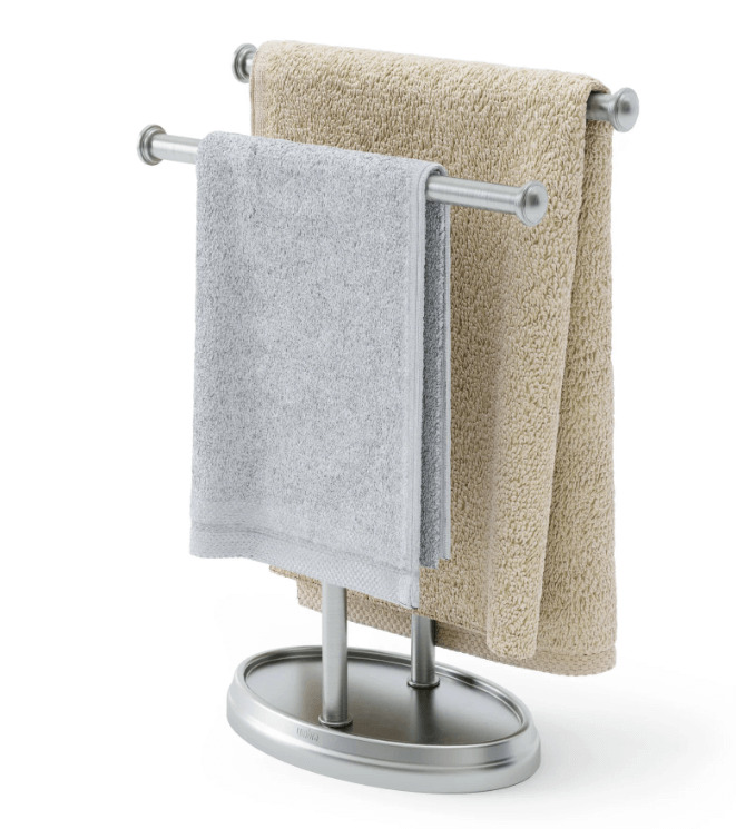 Palm Double Towel Tree keeps towels clean and orderly, and your countertop organized. The elegant towel stand is designed using strong metal, and a sleek nickel-finish. Its compact dimensions allow it to be easily stored on any surface. Fulfilling its intended purpose of holding 2 hand towels, Palm's base can also be used as a tray for miscellaneous items. This towel tree is made with an eco-friendlier finish. It produces 85% less water and solid waste than traditional electroplating finishes.