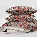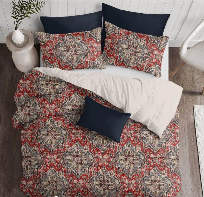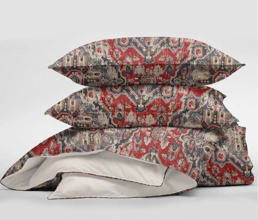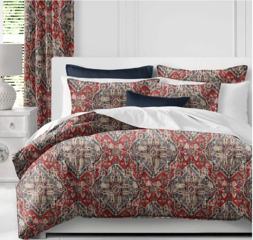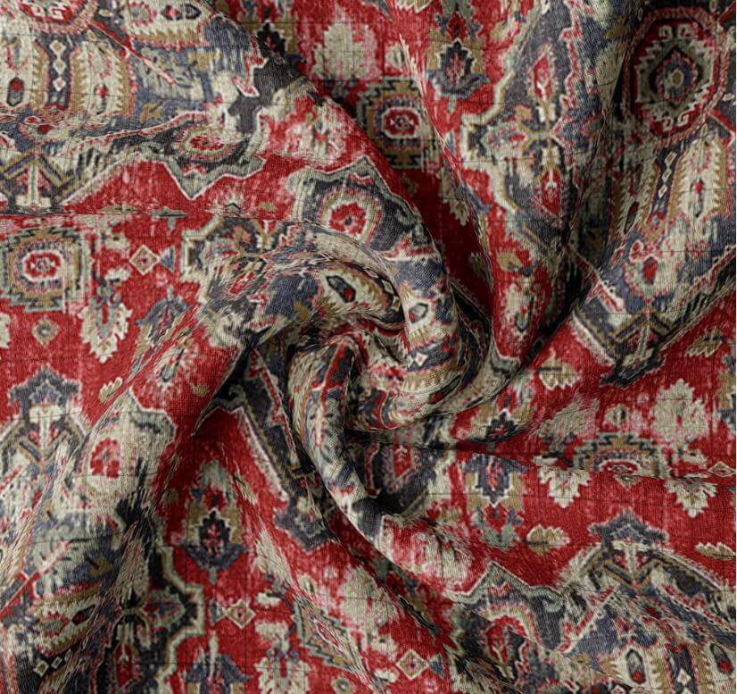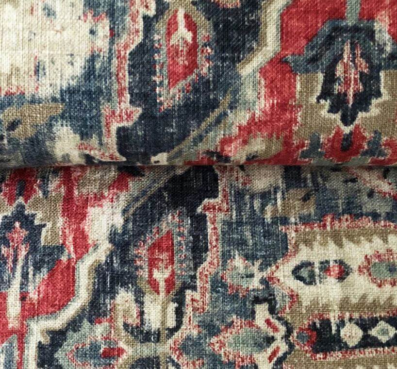 Charvelle's large-scale motif in shades of rouge and navy is woven with a soft linen blend. Inspired by the rich patterns and colors of Kilim carpets, Charvelle has the warmth and history of old-world charm from far-off places.