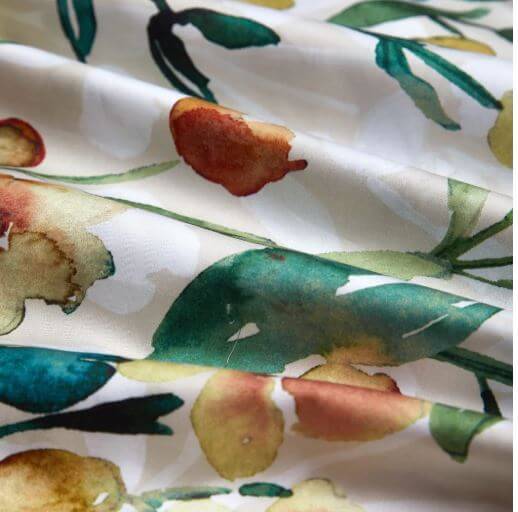The Floriade Duvet Cover and Pillowcases Set is a luxurious addition to any bedroom, featuring an elegant design that blends rich warm amber tones with deep, lush greens.