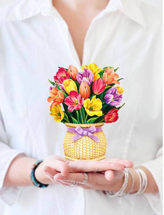 Festive Tulips Bouquet features a dazzling collection of sustainable, vibrant blooms that radiate the essence of spring long after the season ends. Including a woven basket vase with a real satin bow, our eye-catching palette of soft lavender, bubbly yellow, lush coral, and glamorous pink is a wilt-proof and planet-friendly alternative to traditional cut flowers. Your family and friends will always remember how much you care as they unbox the delight of tulips.