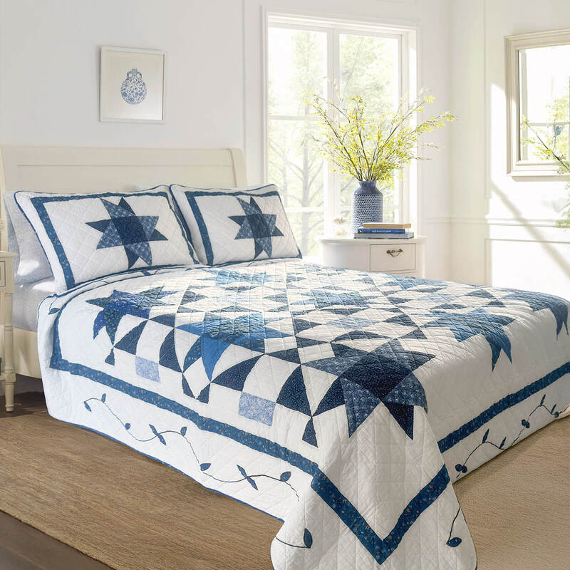 The Blue Print Quilt is a stunning blend of traditional artistry and modern comfort. This exquisite design features a classic patchwork star pattern in rich shades of blue, beautifully contrasted against a crisp white background. Each intricate piece is meticulously quilted, creating a handcrafted heirloom-quality look that brings warmth and charm to any bedroom.