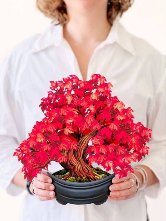 A glorious, bonsai-style Red Maple Tree is artfully presented in an organically refined stone pot — the unique arbor symbolizing serenity and depth. With distinctive perforated leaves creating a stunning visual contrast with their crimson-red hues, the FreshCut Paper Red Maple Tree is timelessly elegant and lasting keepsake. A perfect centerpiece for cozy corner, or to liven up a kitchen or dining room; the airy lightness in the Red Maple Tree’s sturdy roots and branches harmonize with ease. This stunning tree makes a gracious thank-you gift, or a delightful treat for yourself.