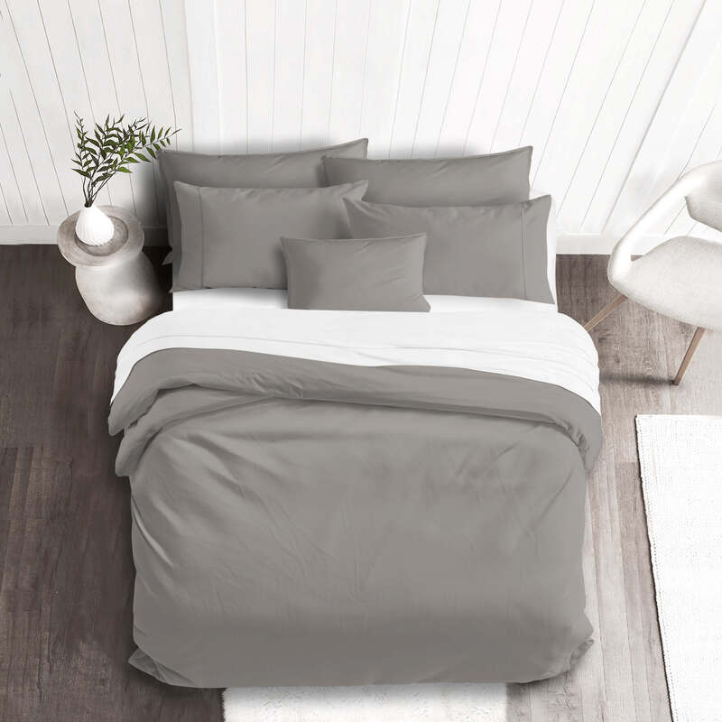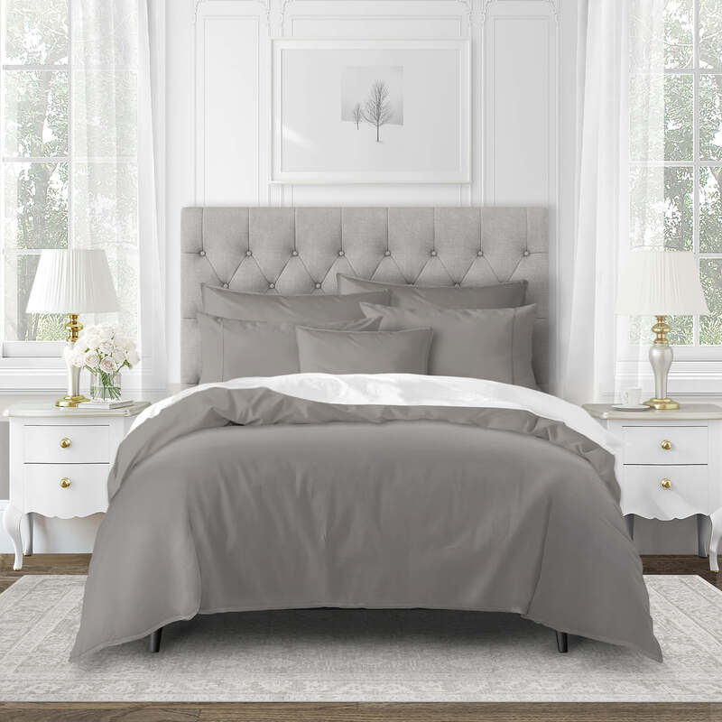 Fabric Content: 100% Cotton Sateen, 300 Thread Count. Reverses to Stone Gray 100% Cotton Sateen, 300 Thread Count