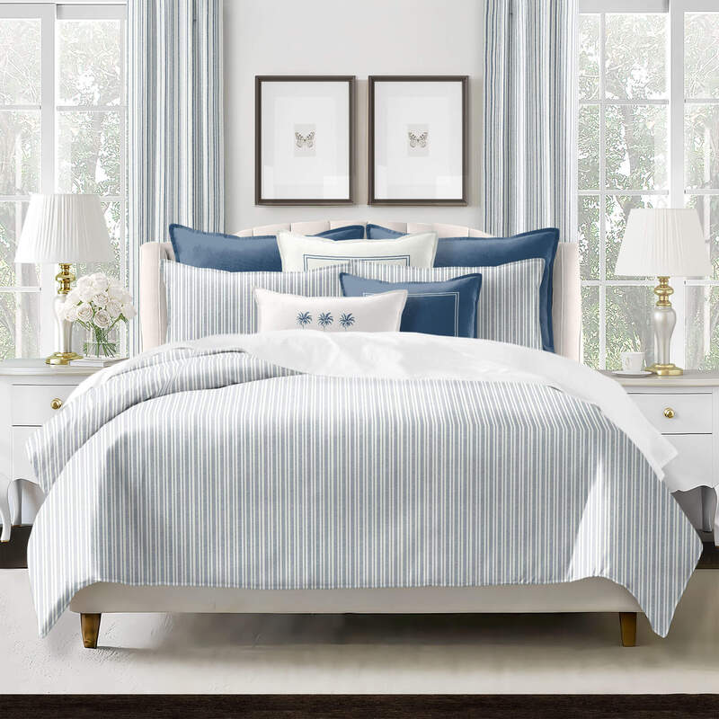 Duvet cover, coverlets, comforters, shams and cushions are finished with a half-inch trim detail with seams perfectly pattern matched.