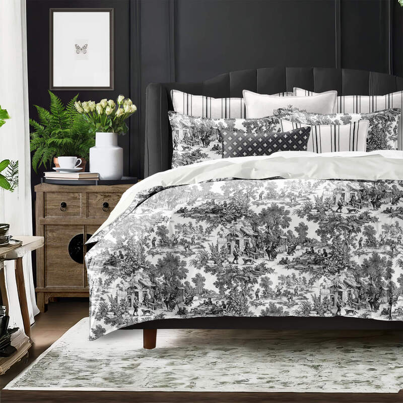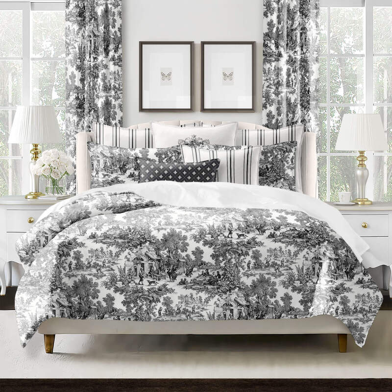 Duvet cover, coverlets, comforters, shams and cushions are finished with a half-inch trim detail with seams perfectly pattern matched.