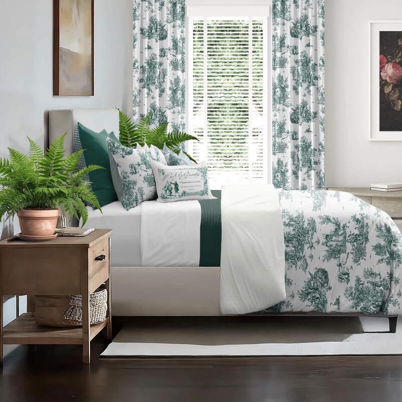 Step into a timeless pastoral scene with our Jardin Du Jouy bedding ensemble. The soft ivory twill fabric serves as the canvas for this classic toile theme.