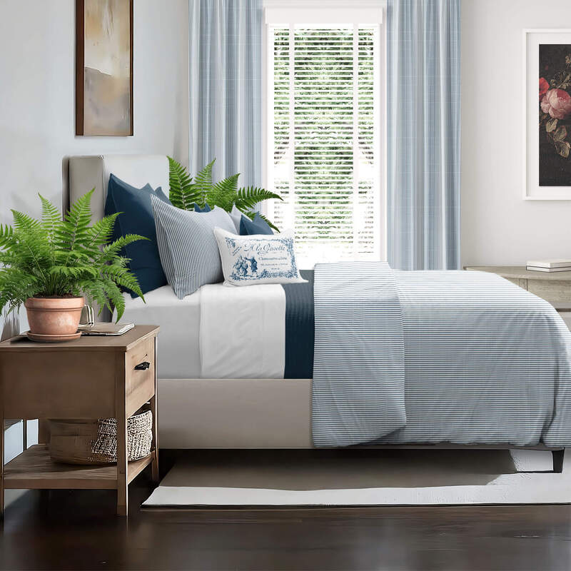 Jaxon’s ticking stripes are a testament to quiet elegance. Printed on a soft twill base in soothing ivory, this ensemble embodies understated luxury.