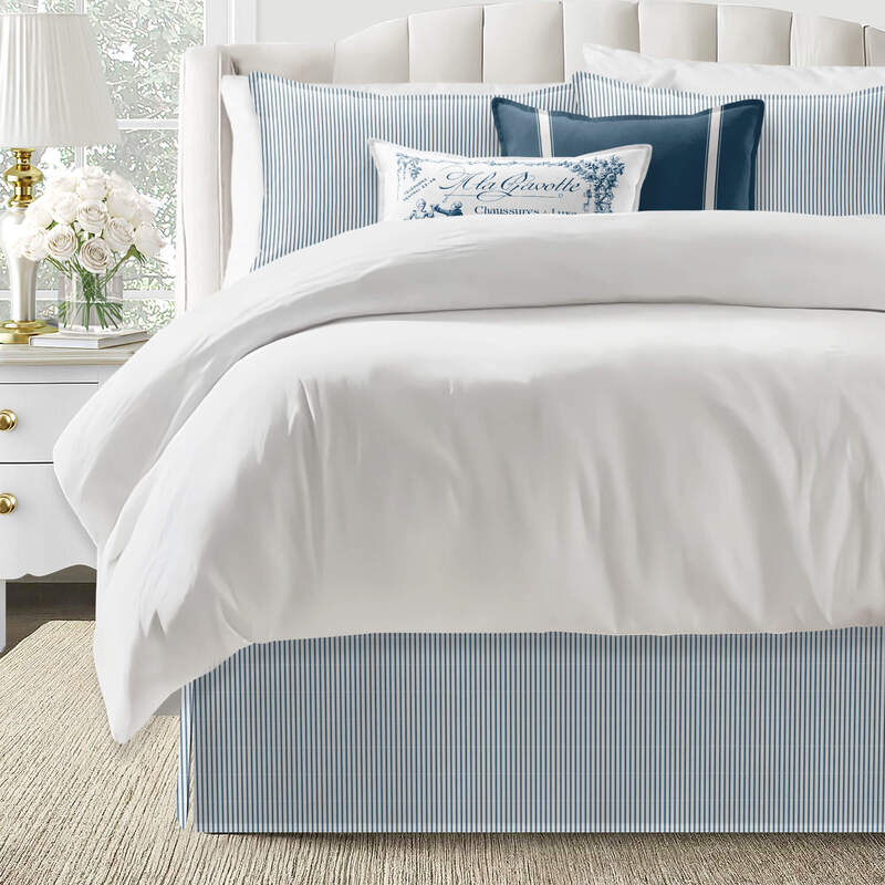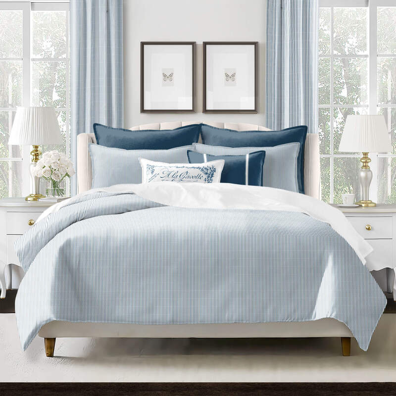Duvet cover, coverlets, comforters, shams and cushions are finished with a half-inch trim detail with seams perfectly pattern matched.