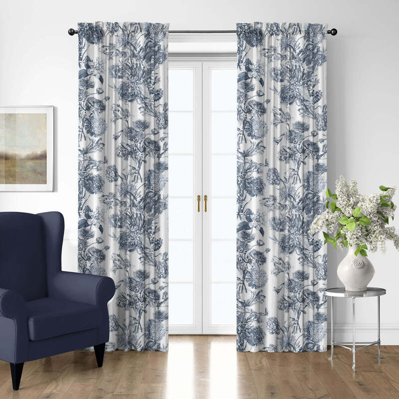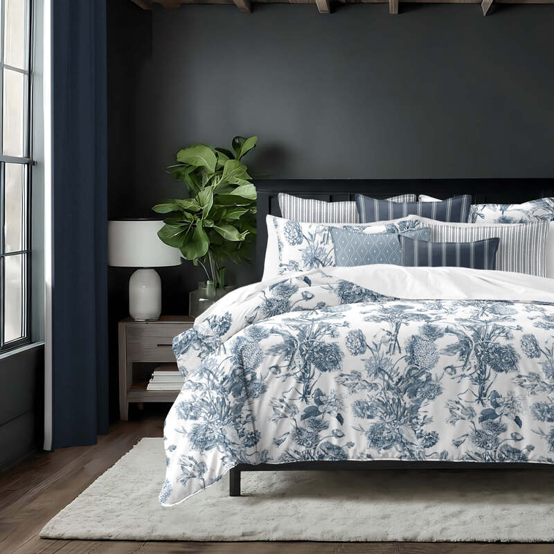 Alexandria is where elegance meets sophistication. Featuring a stunning hand-painted, large floral motif in shades of denim blue, soft gray, and navy, on a white backdrop, Alexandria adds a touch of artistic charm to your space. The intricate design is complemented by the luxurious feel of the fabric, ensuring a perfect blend of style and comfort.