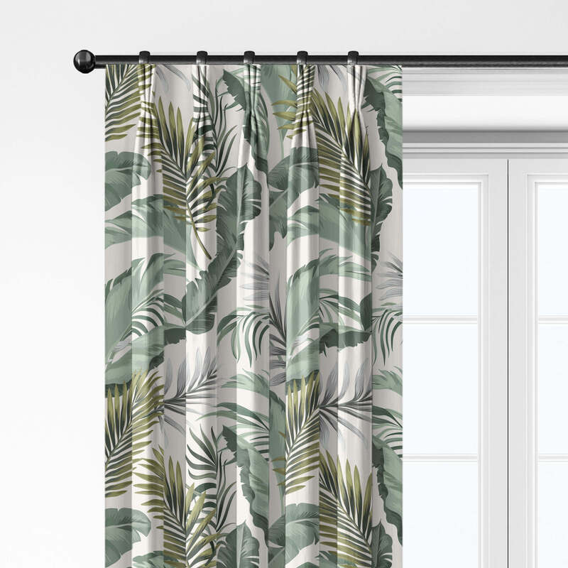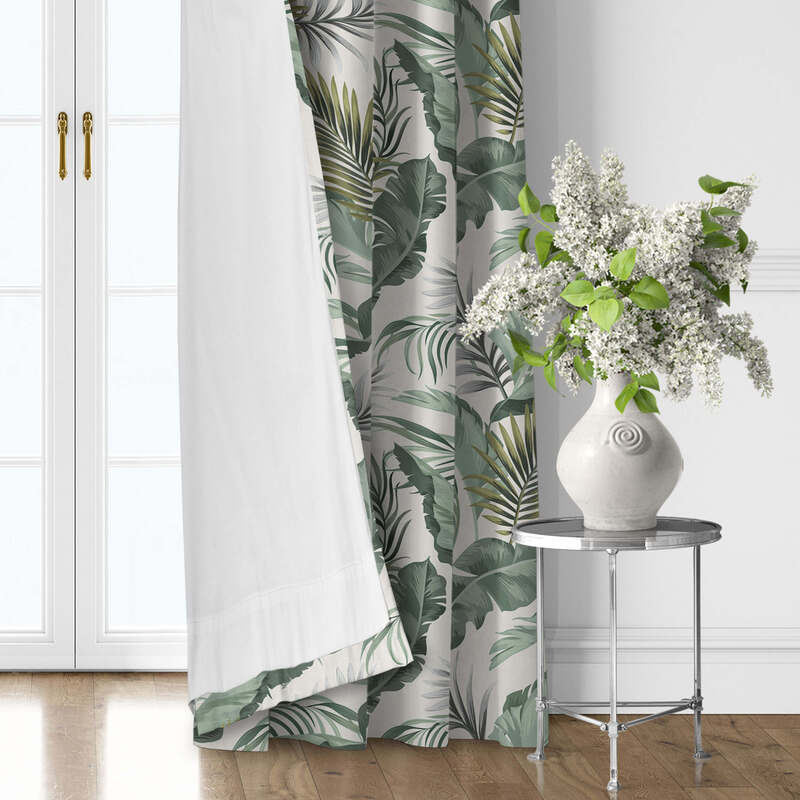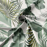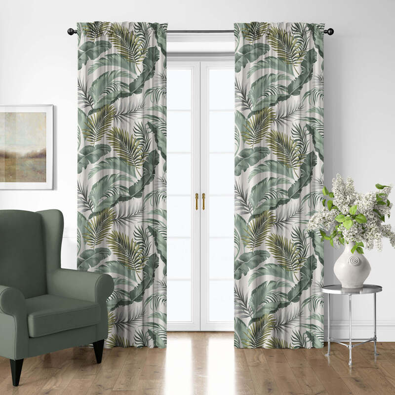 Frondosa’s tropical Palm Design features large, lush palm fronds in vibrant shades of soft sage green, beautifully accented with a splash of lime. The design is set against a soft antique white backdrop, creating a perfect blend of elegance and nature-inspired charm.