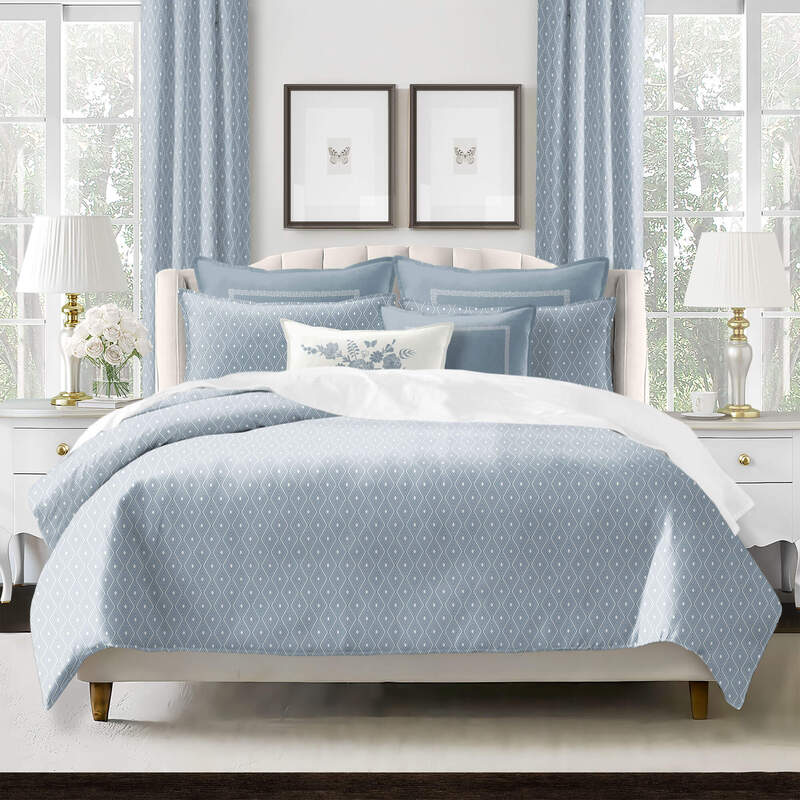 Duvet cover, coverlets, comforters, shams and cushions are finished with a half-inch trim detail with seams perfectly pattern matched.