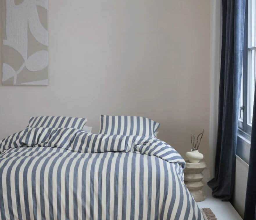 - Blue striped duvet cover set on a cream background