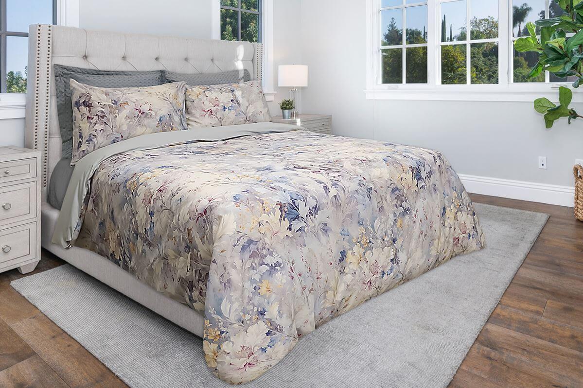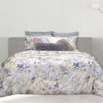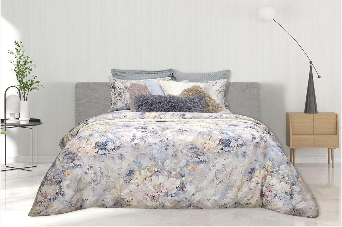 Kore's intricate flowers in blue, cream, grey, taupe and burgundy are at the core of this exquisite floral design printed on cotton sateen.