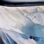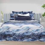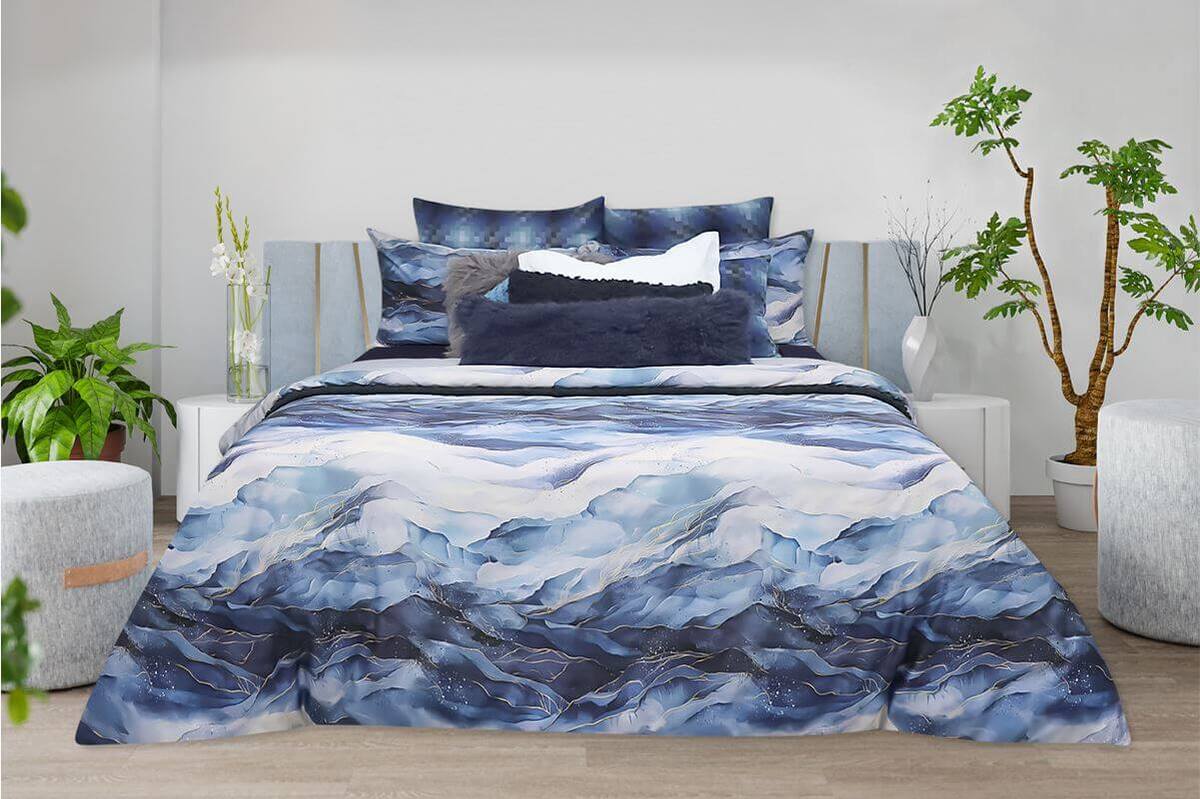 Lively blue waves sparkling gold at their crest, printed on cotton sateen, make Saura's abstract design both an impressive and a calming decor choice.
