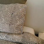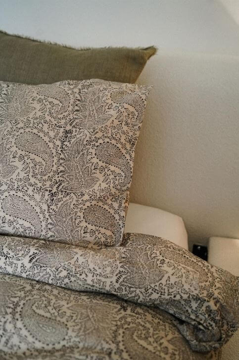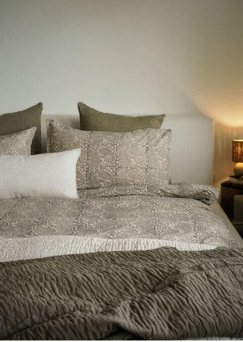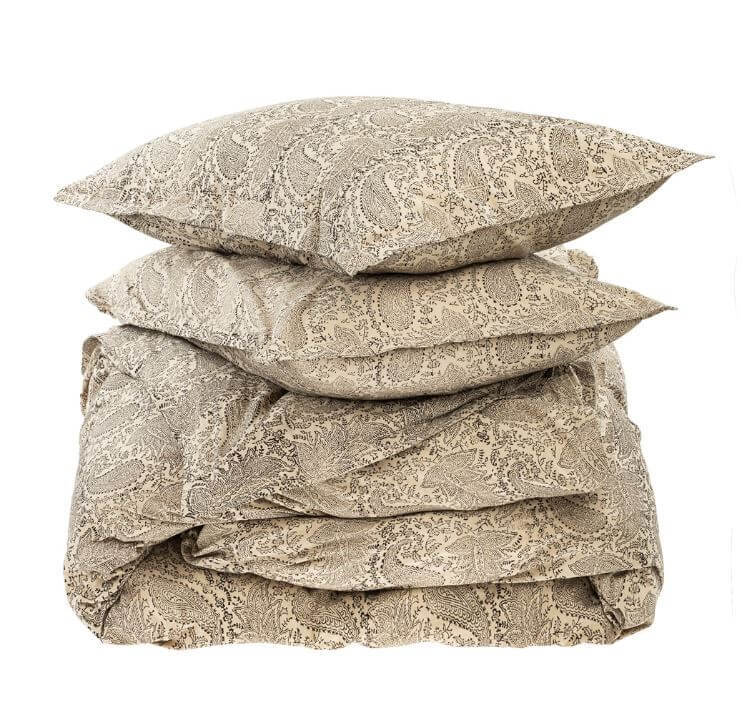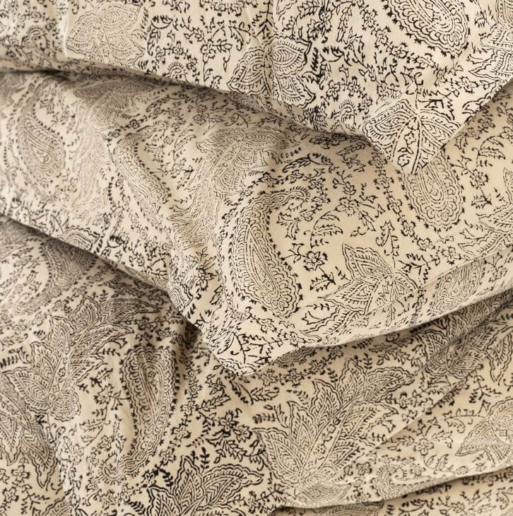 Bring warmth and sophistication to your space with the Saira Block Print Queen Duvet Set. Featuring a hand-block printed black botanical paisley-inspired design, this duvet set blends artisanal craftsmanship with timeless beauty. Crafted from 100% cotton and finished with eco-friendly coconut shell buttons, it offers both luxury and comfort. The earthy tones and intricate patterns create a serene, grounded atmosphere, perfect for elevating your bedroom decor.
