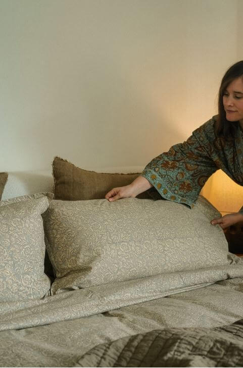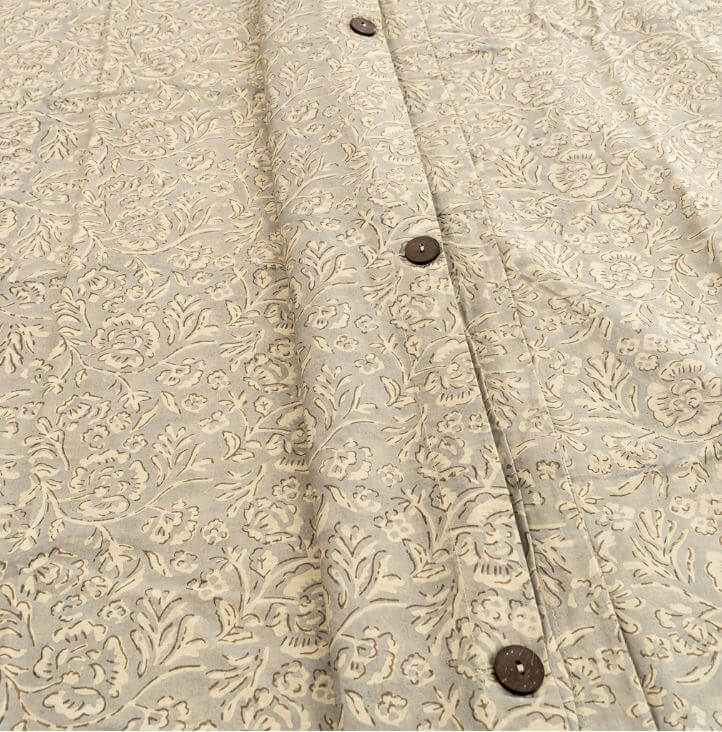 Infuse your bedroom with the subtle elegance of the Anju Block Print Queen Duvet Set. Featuring a soft blue-grey background adorned with a warm cream and brown botanical pattern, this duvet set brings an air of delicate sophistication to your space. Hand-block printed using traditional artisan techniques, the Anju Duvet reflects meticulous craftsmanship and timeless beauty. Finished with eco-friendly coconut shell buttons, it offers both luxury and sustainability.
