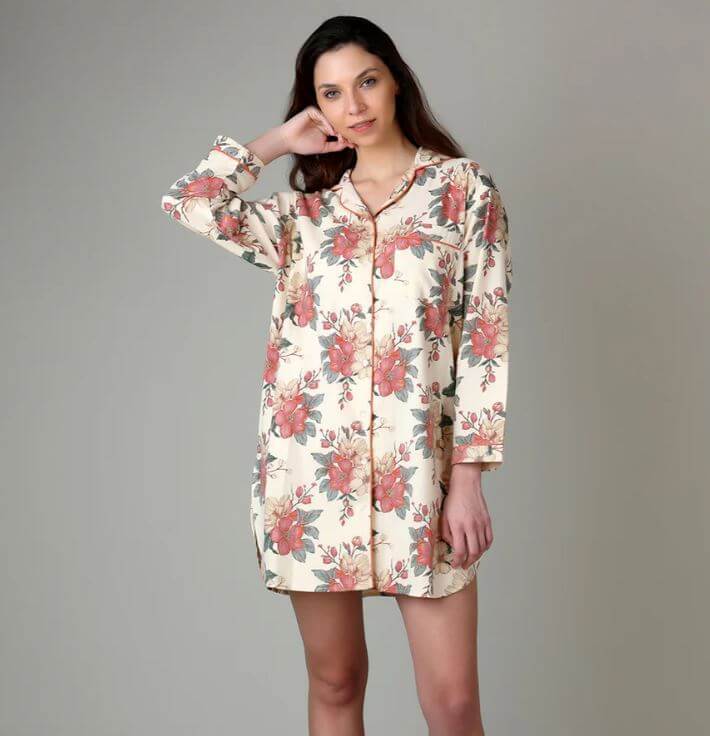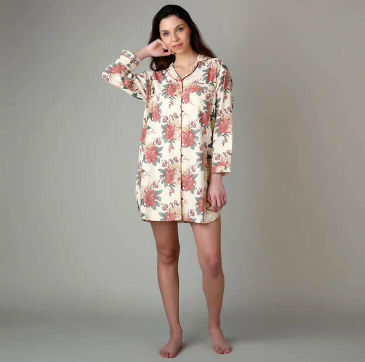Beatrice brings cozy charm to your bedtime with its soft, breathable cotton flannel fabric—perfect for cooler nights. Featuring a relaxed, knee-length fit and long sleeves, this button-down sleep shirt is adorned with a vintage-inspired floral print in warm, inviting tones. The classic collar and subtle piping add a tailored touch, while the natural softness of cotton flannel ensures lasting comfort. Ideal for lounging or sleeping, Beatrice wraps you in warmth with effortless style.