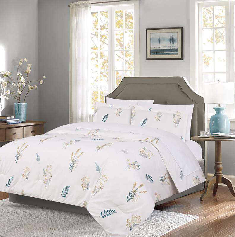 Bring the charm of a blooming meadow into your bedroom with the Gardener Bed-in-a-Bag set from the Swiss Collection. Featuring a crisp white backdrop adorned with soft botanical prints in golden and teal accents, this set creates a fresh, light, and inviting atmosphere perfect for every season.