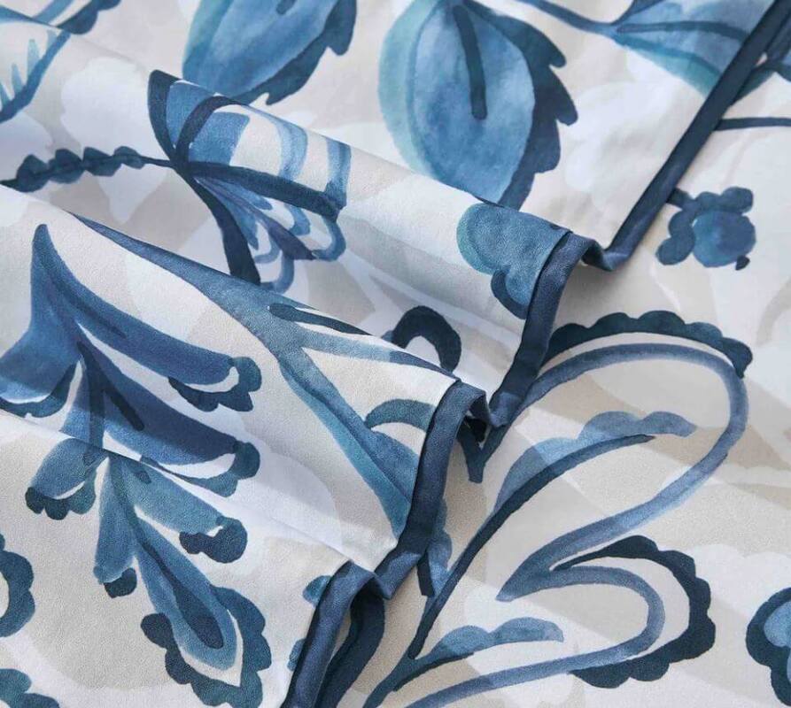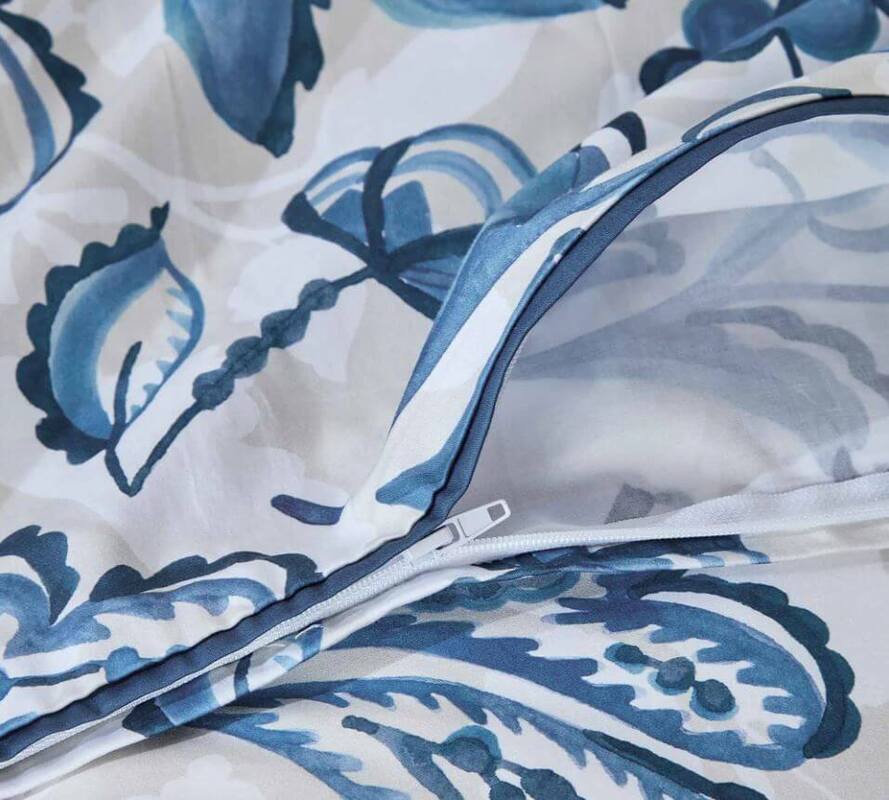 The Canopy duvet cover set makes a bold statement with its hand-drawn leaf motif, flowing in shades of mid blue, navy, and teal across a soft white and putty-toned backdrop. The layered design captures the freshness of nature while maintaining a crisp, modern aesthetic. Striking yet serene, Canopy brings an energizing, grounded elegance to any bedroom.
