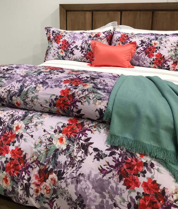 Transform your bedroom into a serene painterly escape with Giverny, a stunning floral collection crafted in Portugal using premium woven cotton. This design blends soft violet and lilac tones with vibrant crimson, plum, and fresh green accents, echoing the dreamy colour palettes of Monet’s iconic garden.