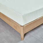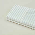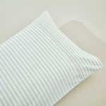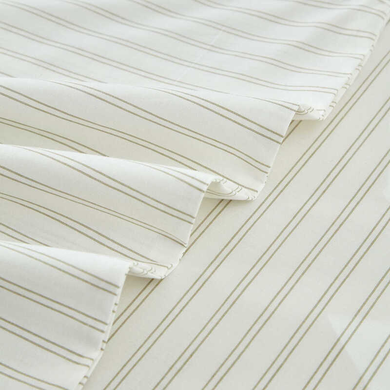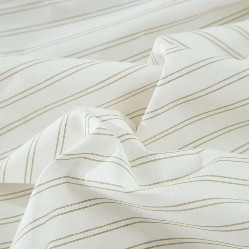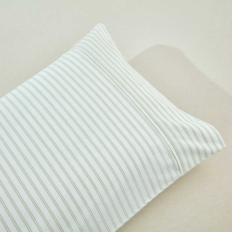 The Vale Green duvet cover set features subtle double pinstripes in green on a soft cream background, offering a clean yet visually interesting pattern.