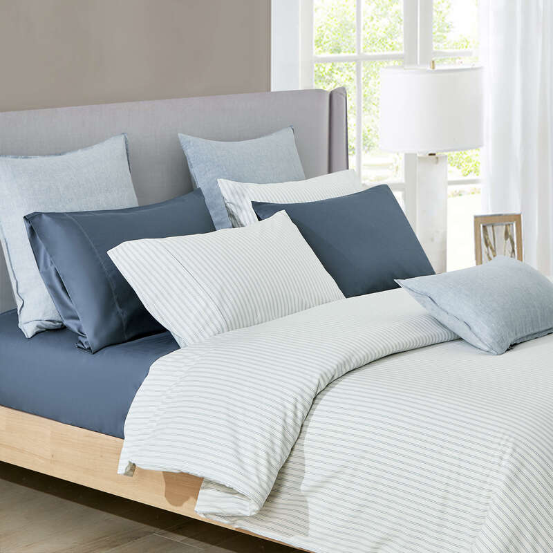 The Vale Green duvet cover set features subtle double pinstripes in green on a cream background. Clean yet interesting, it brings a subtle pattern to your room. Crafted from 200 thread count yarn-dyed cotton percale, this cover is crisp and breathable, providing a smooth, matte finish with lasting durability ideal for year-round comfort.