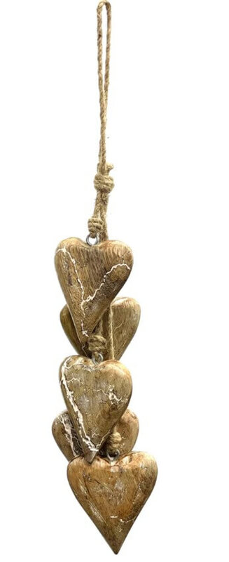 These lovely white flame finished string of hearts are handcrafted from mango wood by our artisans in India.