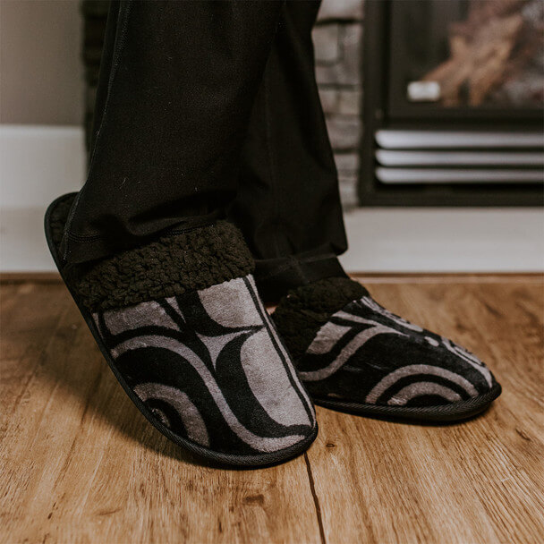 Native Northwest Slippers are designed for maximum softness. Their extra-soft printed flannel fleece with black sherpa trims on top of memory foam, and their rubber soles make these slippers perfect for indoors. These are snug-fit slippers, if you wear a half size, please order one size up.