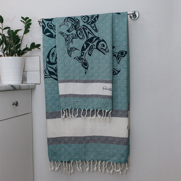 Native Northwest Artisan Cotton Towels are soft, lightweight, and super absorbent. Each towel is handcrafted with care by the artisans and goes through a two-step process consisting of hand weaving and screen printing.