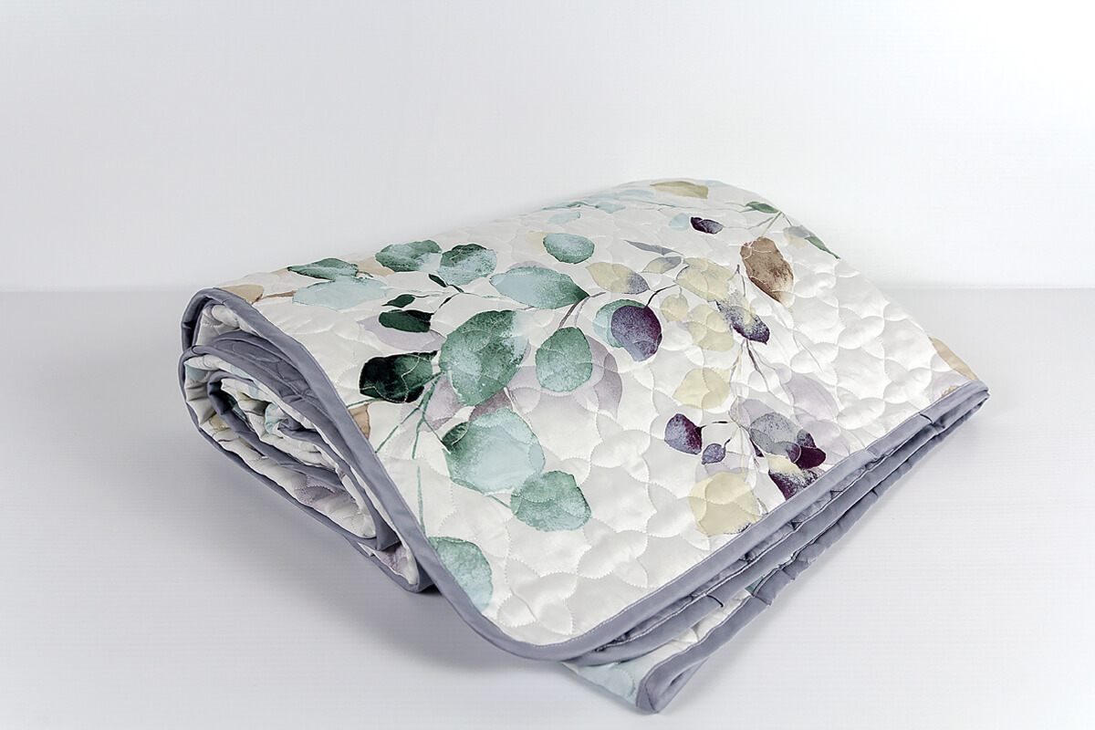 Lushly detailed leaves in subtle shades of aqua, taupe, moss and berry play up the enduring appeal of nature inspired beauty.
