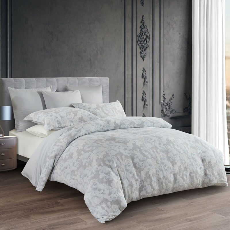 Mirage is a soft floral tapestry in greys, warm whites and a hint of soft blue.