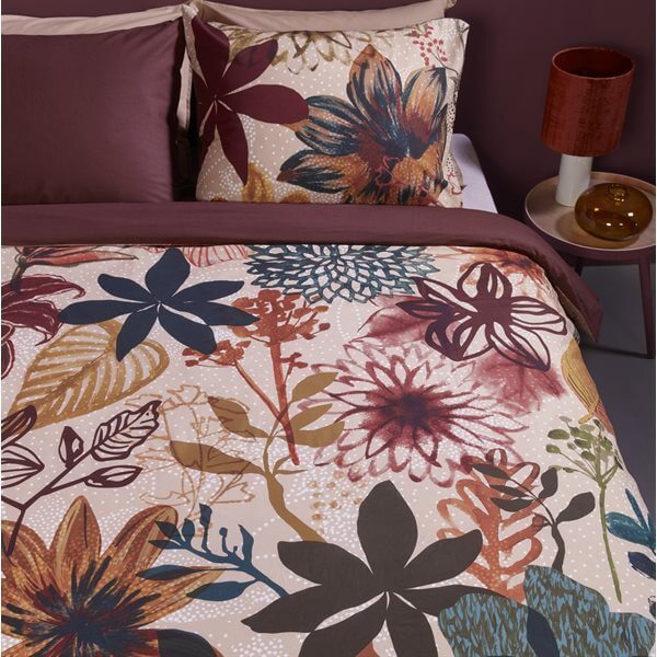 Add a splash of colour to your bedroom! Shades of mustard, plum and turquoise on a beige background.