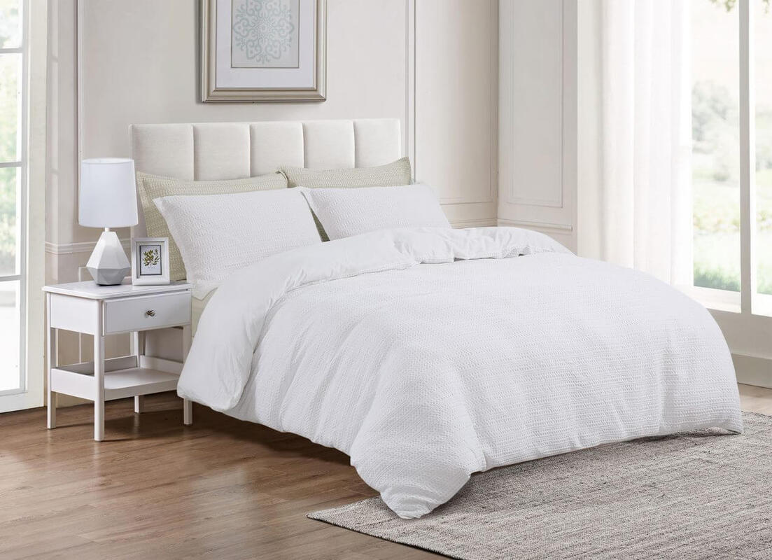 Our Solene White duvet cover and sham set is woven in a ladder waffle adding textural interest to your bed. The neutral tones are sophisticated giving a modern feel to your décor.