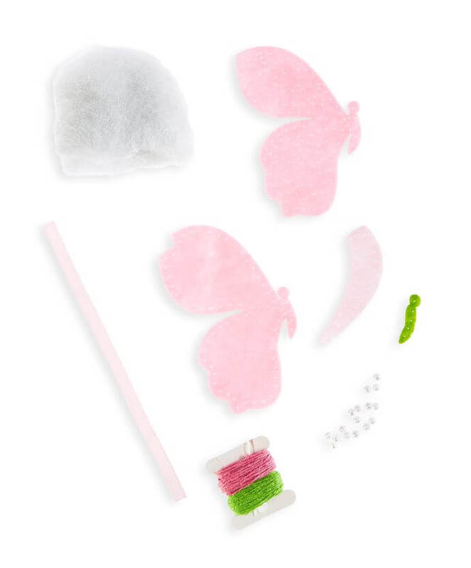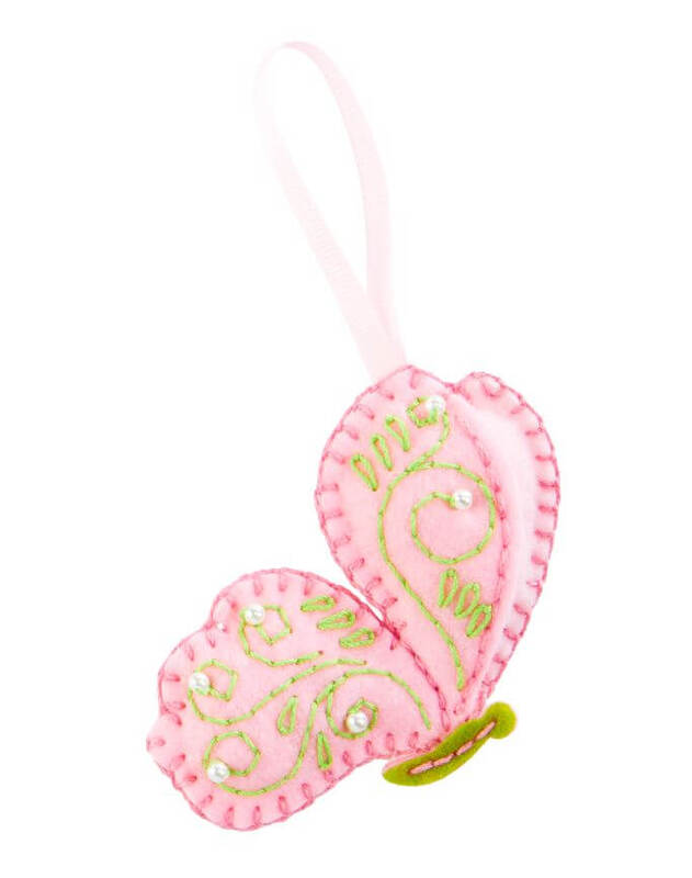 Pink Butterfly DIY Felt Ornament Kit includes: Felt, Batting, Sewing Thread, Plastic Needle, Plastic Beads, and Ribbon. Sew it together and trim your tree with your own Christmas creations.