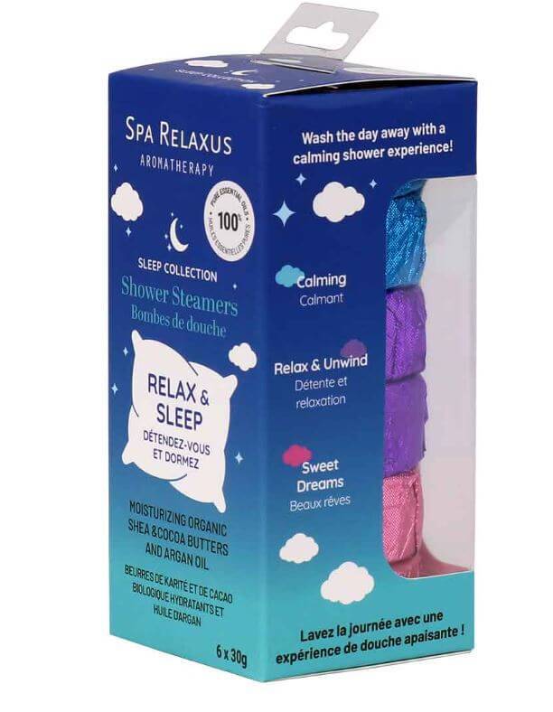 The Relax & Sleep Shower Steamers 6 Piece Gift Set (6 x 30 g) with essential oils, moisturizing organic shea, cocoa butter and argan is perfect for washing the day away with a calming shower experience to help you relax and unwind. Each set includes 2 of each Calming, Sweet Dreams, Relax and Unwind.